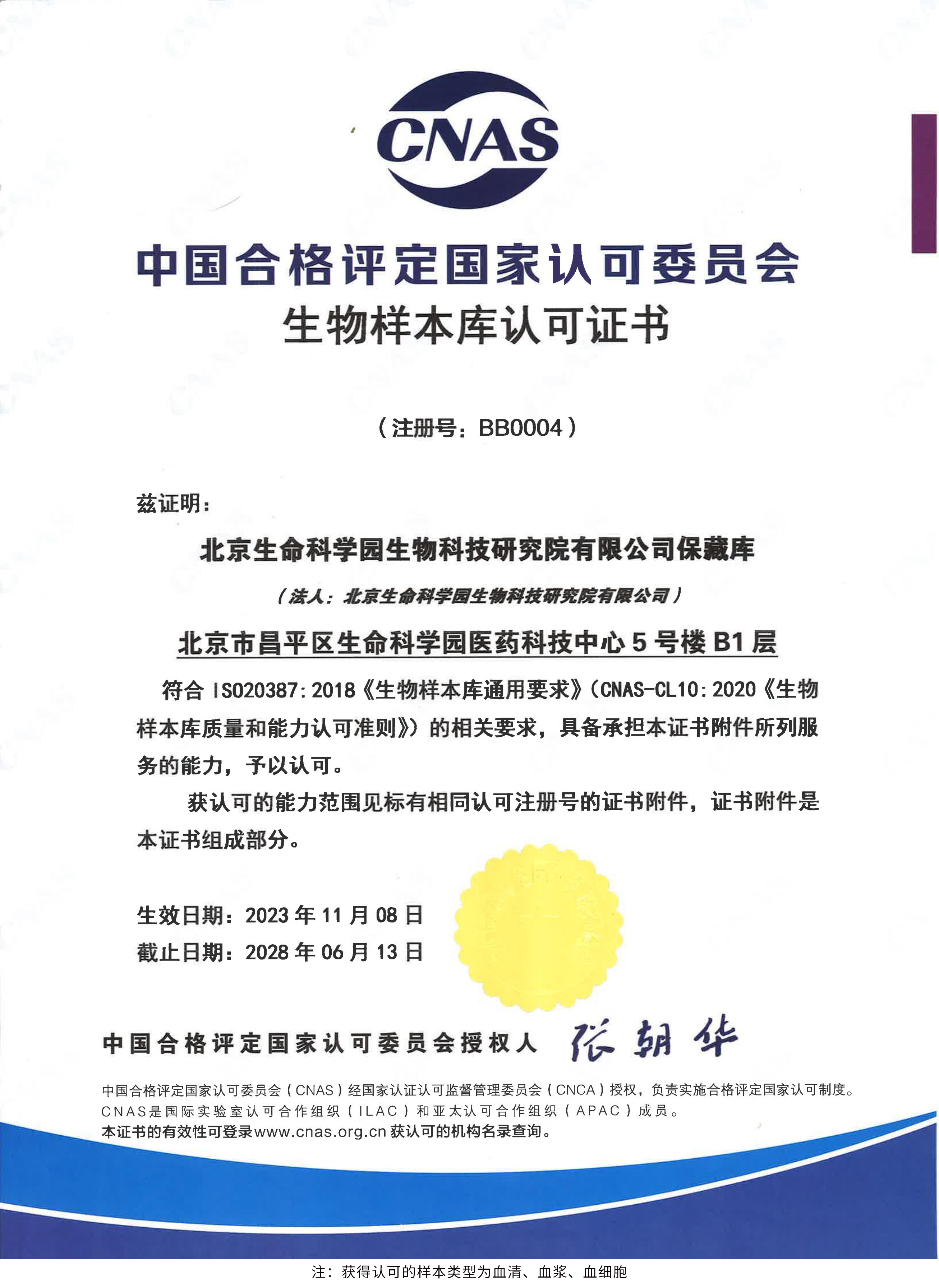 北京生命科學(xué)園生物科技研究院(以下簡稱“北京生物樣本資源庫”)(Biobank of Life Science Park,簡寫“BoLSP”)是一家由北京市科委和中關(guān)村生命科學(xué)園共同支持設(shè)立的第三方生物樣本庫公共服務(wù)平臺(tái),秉承北京重大疾病臨床數(shù)據(jù)和樣本資源庫(以下簡稱“北京庫”)(Beijing Biobank of Clinical Resources,BBCR)十余年的發(fā)展成果,聚合眾多臨床樣本專家的專業(yè)共識,致力于在生命科學(xué)、生物醫(yī)藥研究領(lǐng)域發(fā)揮銜接樣本資源持有者與研究者的橋梁作用,解決生物樣本資源開發(fā)上下游信息不對稱、資源共享困難等問題。研究院在北京中關(guān)村生命科學(xué)園昌平園區(qū)建立了2000㎡生物樣本庫,最大存儲(chǔ)規(guī)模達(dá)1000萬份。研究院遵循CNAS-CL10:2020《生物樣本庫質(zhì)量和能力認(rèn)可準(zhǔn)則》,同時(shí)結(jié)合北京庫過去十年的工作經(jīng)驗(yàn)與教訓(xùn),建立了一套完善的生物樣本保藏質(zhì)量管理體系,從人、機(jī)、料、法、環(huán)、控多個(gè)角度,實(shí)現(xiàn)生物樣本保藏過程的全面質(zhì)量控制,先后獲得國家科技部頒發(fā)的人類遺傳資源保藏行政許可證書和中國合格評定國家認(rèn)可委員會(huì)(China National Accreditation Service for Conformity Assessment,CNAS)頒發(fā)的“CNAS認(rèn)可證書”。